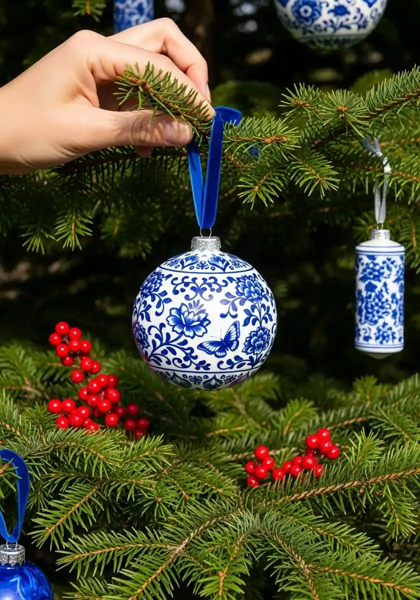 Sometimes the best idea is tiny. Hang a blue-and-white floral bauble from a rich blue velvet ribbon on a sturdy evergreen branch. Tuck in bright red berry picks nearby. The contrast is crisp and traditional. Use this on wreaths, garland, or the main tree. If you’re building a collection of blue and red christmas decor, start here. Buy a few special ornaments every year and mix them with basic shiny balls to stretch the budget. Photograph them up close. It’s Instagram gold.