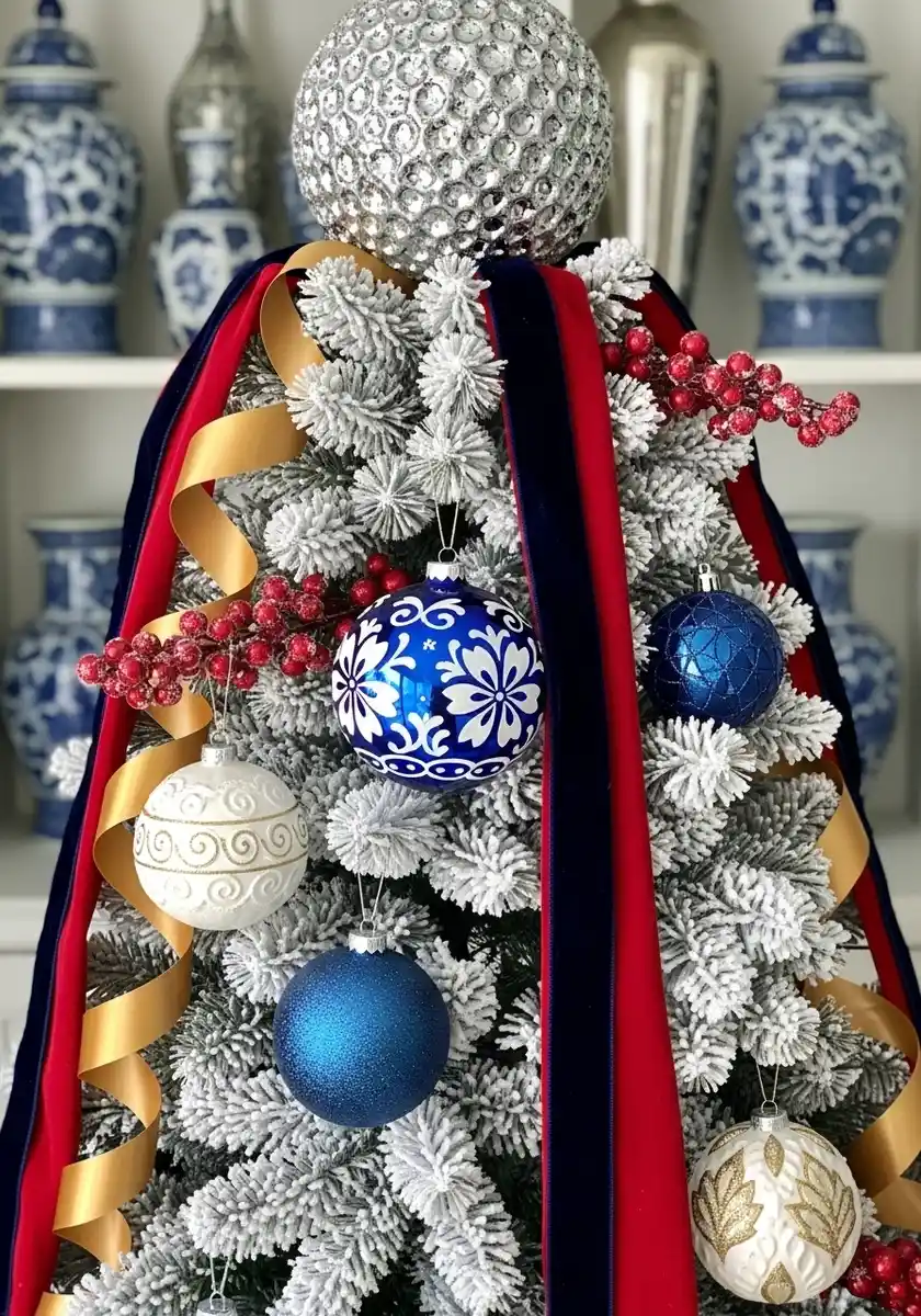 This luxe tree leans into blue-and-white ginger jar style. Run wide ribbon cascades in navy, rich red, and a twist of antique gold down the tree, pinning every 10 to 12 inches so they drape clean. Mix porcelain-look ginger-jar ornaments with mercury glass and frosted sprigs for depth. Copy the palette across the room using a matching garland on the mantel and shelves. The best part of this red and blue Christmas decor idea is how it looks fancy without being fussy. If you own real ginger jars, cluster a few at the base for a museum-but-cozy vibe. Add warm white lights so the gold reads candlelit.