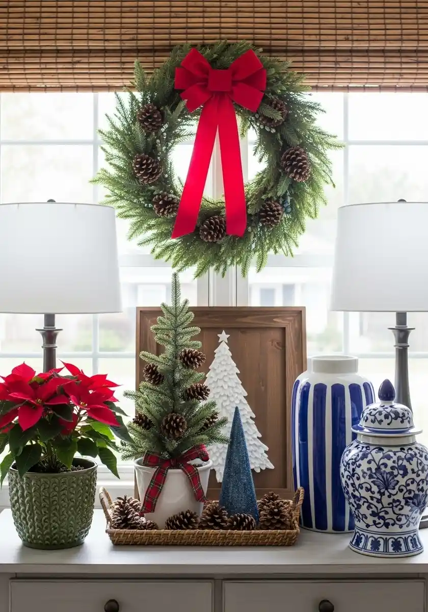 Center a fresh pine wreath with a bold red bow between twin table lamps. Add a poinsettia on one side and blue-and-white ginger jars on the other. In a tray, place a mini pine in a white pot tied with red plaid ribbon, plus a blue glitter cone tree and a scatter of pinecones. A wood plaque with a white tree silhouette ties the natural textures together. This is small-space blue and red Christmas decor at its best. It’s balanced and easy to remove when you need the surface.