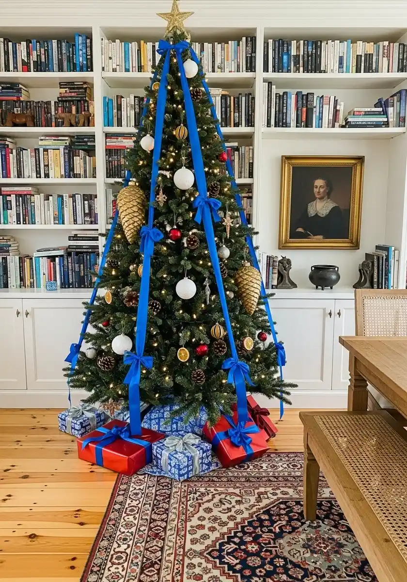In a book-lined room, dress a green tree with long vertical bands of vivid cobalt ribbon. Pin bows at the bottom so the bands look tailored. Mix in classic red and white ornaments, pinecones, and a couple oversized gold pinecones. Wrap gifts in chinoiserie-style blue paper and ruby boxes to finish. This “tenting” technique is a power move for blue and red holiday decorations. It adds structure and makes even an average tree look designer-level.
