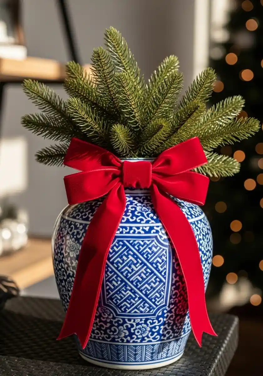 Sometimes one object does the job. Stuff evergreen sprigs into a blue ginger jar, then tie a plush red velvet bow around the neck. Place it on a shelf, console, or bar cart. The glossy pattern and saturated ribbon make a simple but striking accent that reads very red and blue Christmas decor. If you want more, add two votives and a small stack of books with blue spines. Done in five minutes.