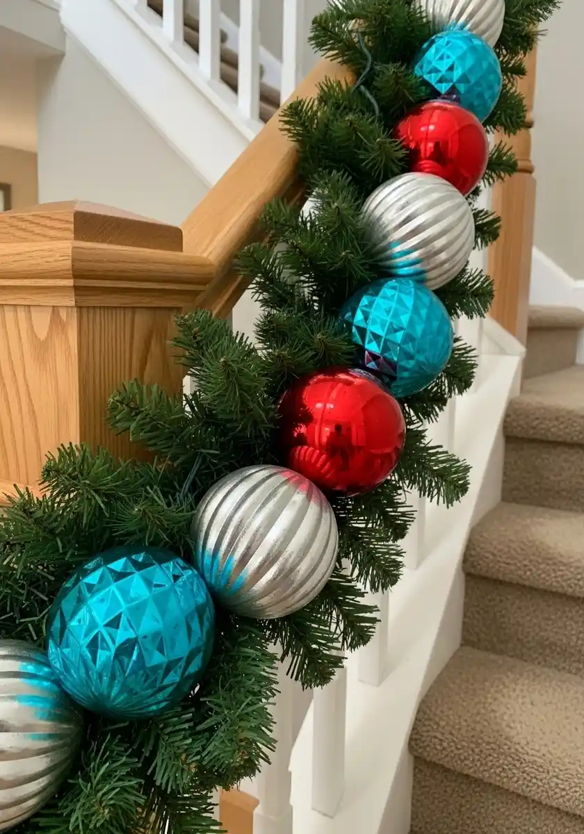 Wrap a thick evergreen garland along the banister and wire in oversized ornaments in aqua, bright red, and satin silver. Mix faceted and ribbed finishes to add dimension. Keep the rest of the hallway neutral so the garland stands out. This is a bold blue and red Christmas decorations statement guests notice the second they walk in. If you have pets, secure with extra zip ties. Finish with a navy bow at the newel post.