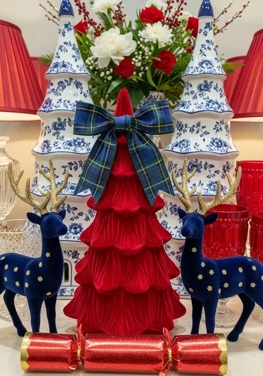 Set a sculpted red velvet tree with a navy-plaid bow between two velvet midnight-blue deer with glittering gold antlers. Behind them, place a pair of blue-and-white pagoda trees and ruby glassware. A bouquet of white blooms and red berries keeps it seasonal. This works on buffets or coffee tables. It’s tactile red and blue Christmas decor that looks high-end but breaks down for storage quickly. I like to sprinkle faux snow just in front for depth.