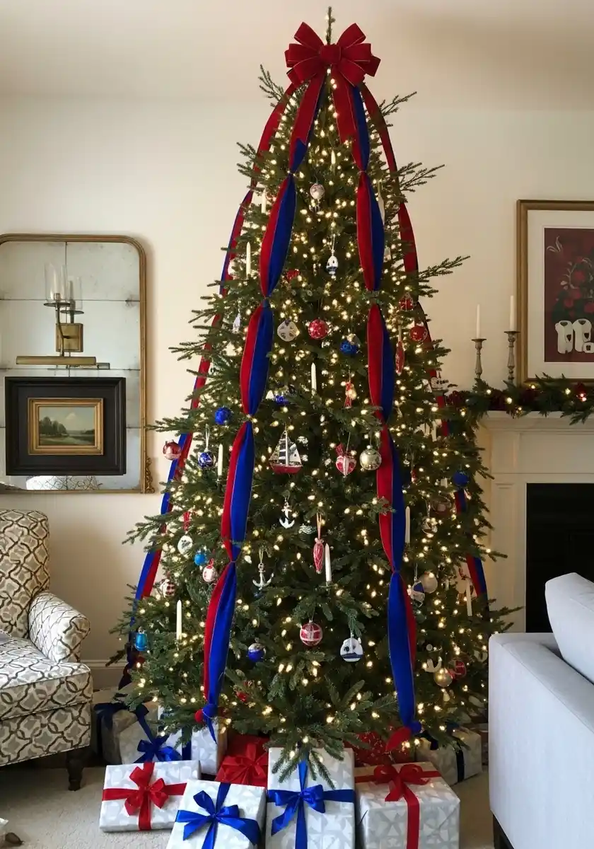 Let ribbons carry the drama. From one large topper bow, run long red and navy strands down a tall tree, letting them pool slightly on the branches. Add nautical and traditional ornaments beneath. Wrap gifts in crisp silver paper finished with bold red and blue bows so the base mirrors the top. This is an easy win for blue and red christmas decor when your ornament stash is small. Ribbons fill space and look professional.