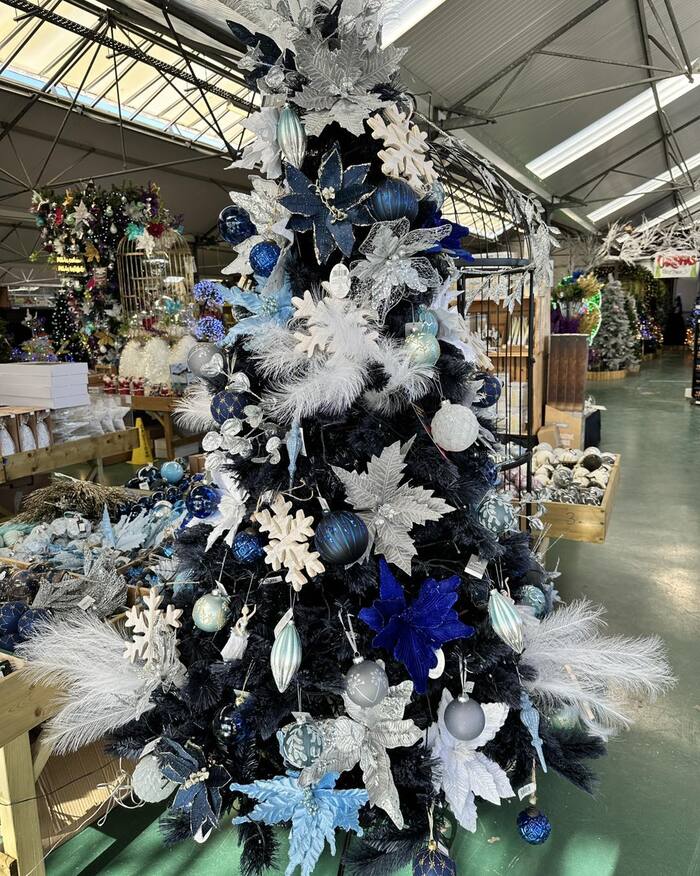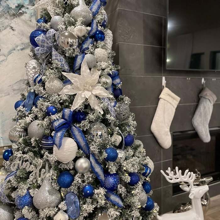 The last design balances all the elements we loved. Flocked branches, cobalt and navy ornaments, mirrored silvers, ribbon loops in blue, plus white poinsettia florals tucked as filler. It’s the safe bet when you want a full look. Start with a triangle pattern of big blue balls. Fill between with silver. Then tuck ribbon loops, then add the flowers last to cover any bald spots.