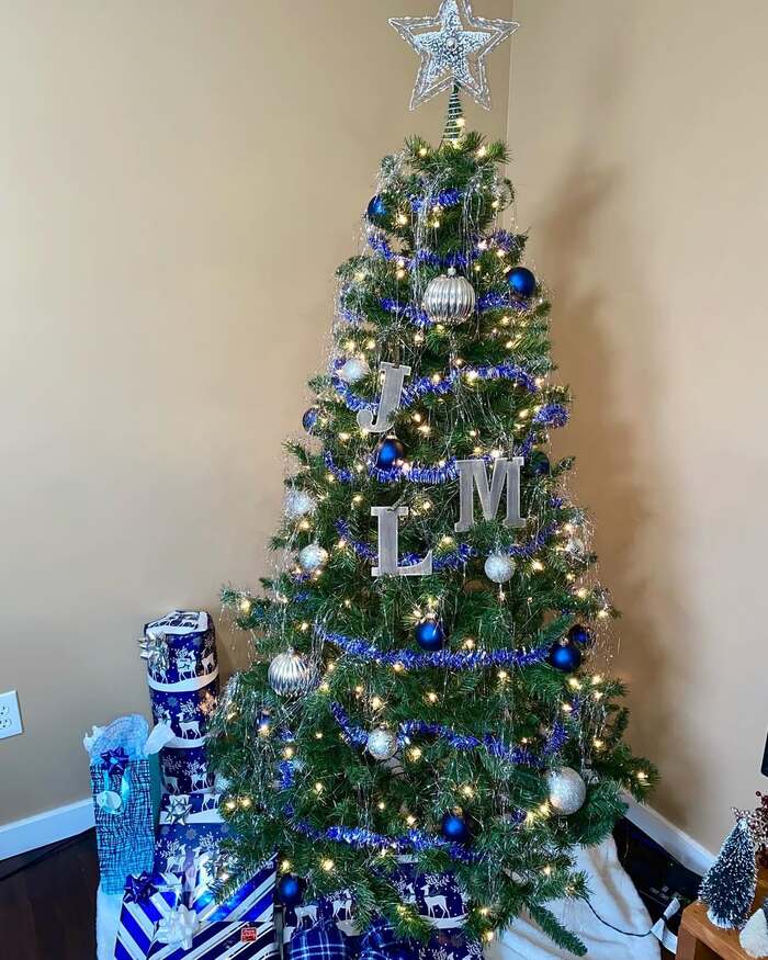 Next hang matte navy balls closer to the trunk and place bright chrome silver near the tips. That contrast adds depth without buying a ton of pieces. The big letters are the secret sauce. Pick 2 to 4 initials, hang them at different heights, and you suddenly have a story. Wrap presents in navy paper with white ribbon to echo the palette. It’s friendly, budget smart, and still hits the blue and silver tree ideas vibe hard.