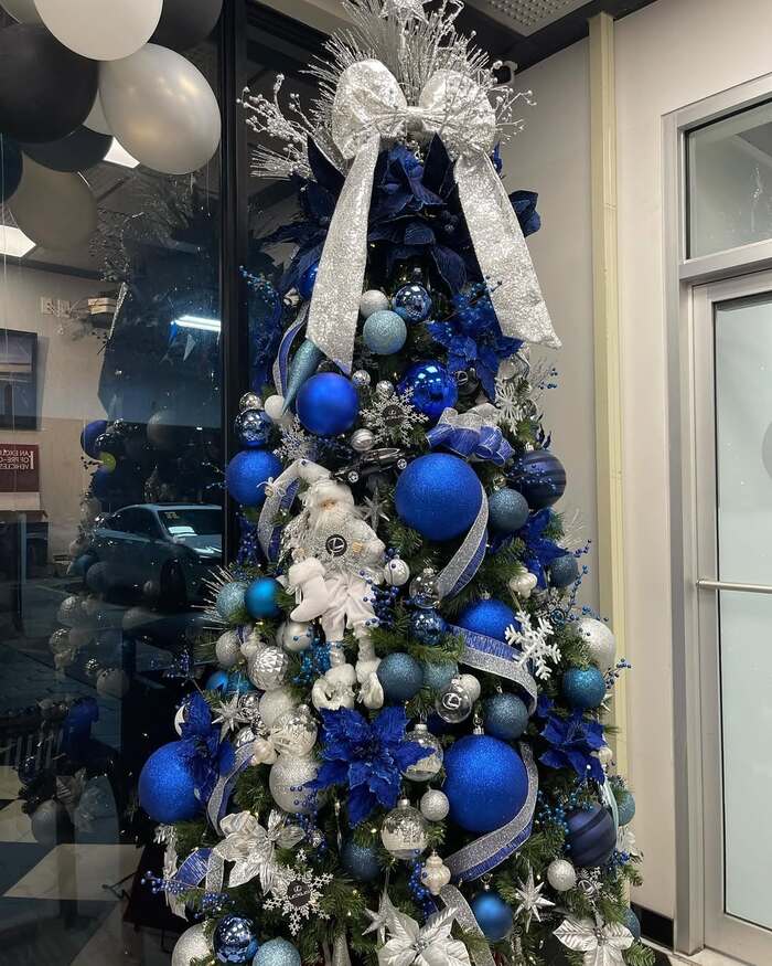 Because the base is dark, silver becomes your light. Add mirrored or disco ornaments near the outer tips so they catch reflections from the room. Don’t forget a few matte ice-blue drops to break up all the circles. It reads modern, a little whimsical, and totally within blue and silver christmas tree ideas territory. If you want a showstopper for an entry or shop, this midnight look is your power move.