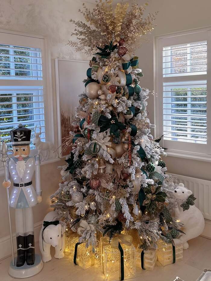 Layer champagne and pearl ornaments as your “neutrals,” then drop in a handful of navy or teal to tie it back to blue and silver holiday tree energy. The topper is feathery and tall which makes the tree look grand without taking more floor space. Display lit gift boxes at the base so the glow continues downward. If you love blue white and silver Christmas tree ideas but your room needs a bit of warmth, this mix nails it.