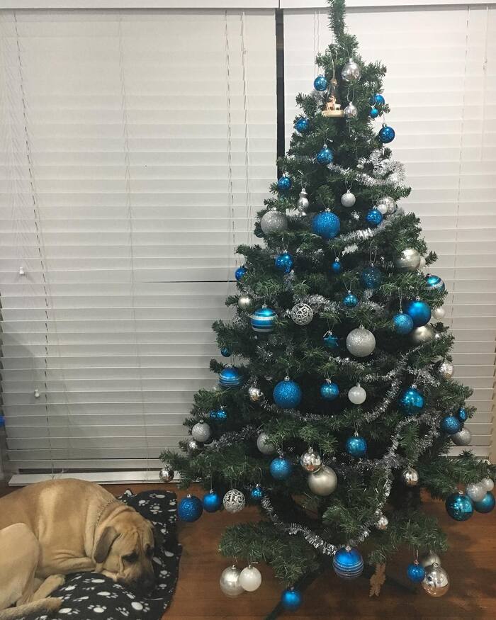 Run a thin tinsel garland in a gentle wave, not too tight, and stop before the last two rows of branches so your pet doesn’t treat it like a toy. To keep the look balanced, stand back every ten minutes and squint. If one side looks heavier, move two ornaments rather than five. That tiny habit keeps the tree calm. For a quick accent, place a navy throw under the stand as a temporary skirt. It’s simple, friendly, and very “we actually live here.”