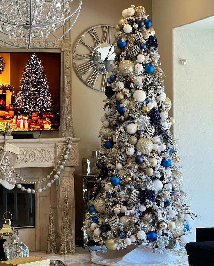 Blue and Silver Christmas Tree Ideas: Cascading Snow-Top Glam