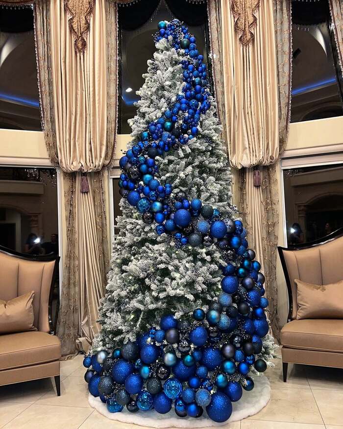 This one stopped me scrolling. The ribbon is not ribbon at all. It’s a spiral river of ornaments. Start by sorting ornaments by size. Place your largest blues at the bottom and trace a gentle curve that wraps around the tree. Keep the space between turns equal, almost like a candy cane pattern. Fill the curve with medium and small balls, mixing matte, satin, and glitter finishes. On a flocked tree the blues look electric.
