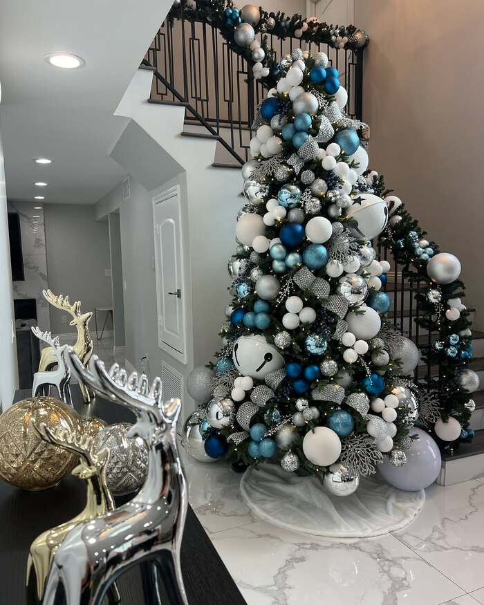 If your tree lives by a staircase, copy this idea. The tree is chunky with round ornaments in baby blue, ice silver, and deep cobalt, and then the banister garland matches the tree’s colors and textures. This creates a visual loop that guides your eye up the stairs. I know that sounds artsy, but it’s real. Start by decorating the tree first. When you love it, take the leftover ornaments and mirror the same pattern into the garland.