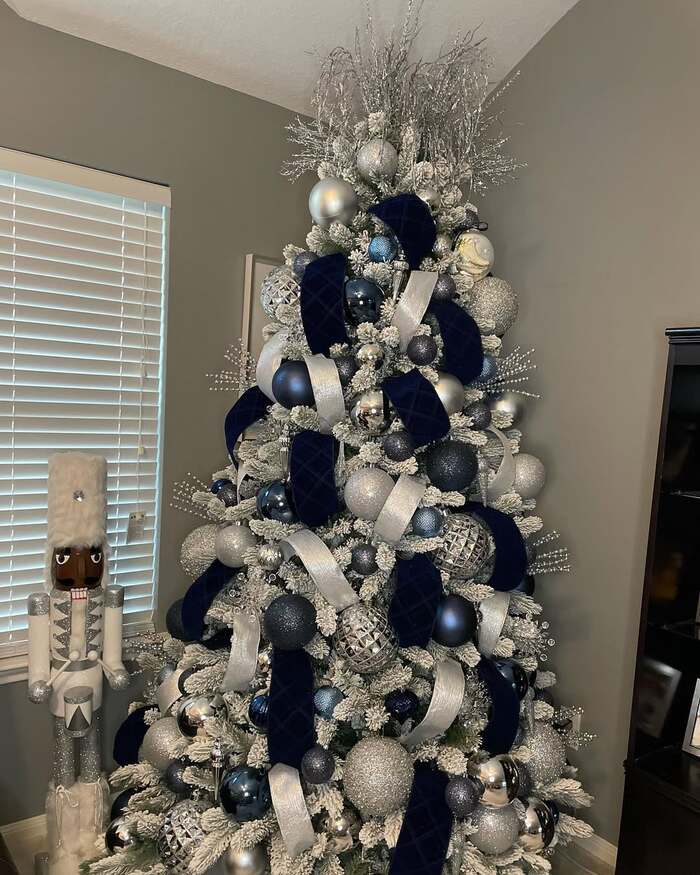 Keep ornaments mostly matte and glitter silver so the ribbons stay the star. A few quilted ball ornaments echo the ribbon pattern. This navy and silver Christmas tree idea is calm, a bit grown up, and very living room friendly. If the rest of your room has texture like a chunky knit throw or velvet pillows, it will feel perfect. Finish with a nutcracker figurine for personality. Mine has weird eyebrows. I love him anyway.