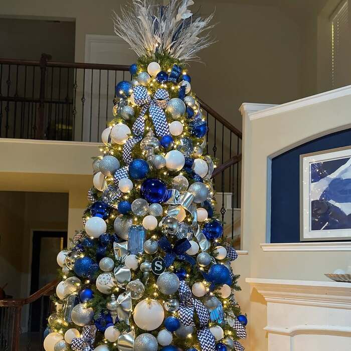 Here’s a fun one. The tree mixes shiny cobalt with soft pearl white and bright chrome, then stacks a bunch of patterned bows. Some checks, some stripes. A feathery topper sprays up like snow grass. To copy it, set your lights to warm white, then hang your largest ornaments first to create the silhouette. After that, add bows in groups of two at slightly different angles. I pin mine with green floral wire so they don’t slide.