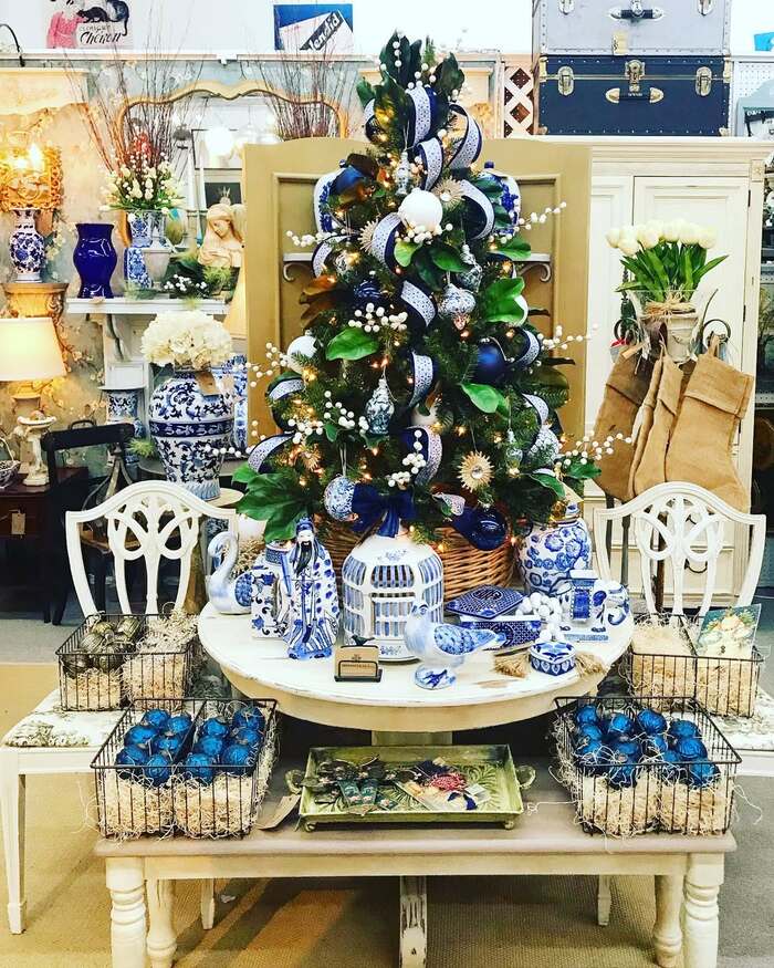 The last idea is small but mighty. A tabletop tree sits in a basket, decked with blue ribbon, porcelain-style ornaments, white berries, and magnolia leaves. Surrounding it are blue and white ceramics. The whole vignette feels like a little story in the corner of a shop or entry table. I’m a fan of small trees because they let you play with theme without committing your whole living room.