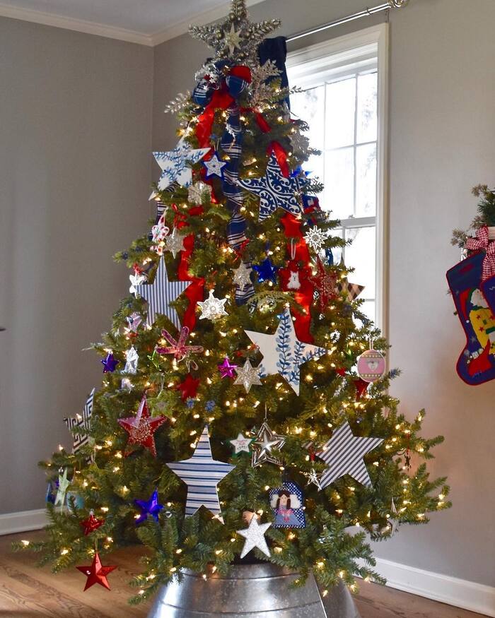 To copy it, set the base first. A galvanized tub or tree collar instantly grounds a blue and white Christmas tree and adds that rustic snap. Run two ribbons, one navy plaid and one red satin, in short swoops pinned with green floral wire. Keep the biggest stars on the outer thirds of the tree so branches don’t sag. Mix blue-and-white stars with white snowflakes so the theme stays clear. This variation leans patriotic, but the blues hold center stage. If the red feels loud, swap half the red pieces for matte white and you still get a bold blue-and-white Christmas tree without color chaos.