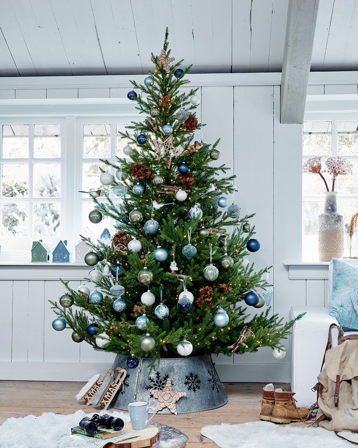 Choose a slim icy blue and white holiday tree and load ornaments tighter. Use a mirror behind the tree to double the sparkle without more lights.
