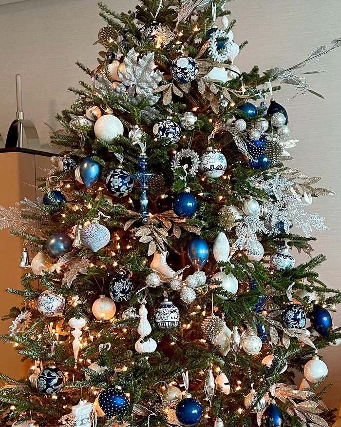 This one is a feast. Cobalt ornaments, white balls, porcelain-style prints, and metallic leaf picks that flash when the lights hit. It feels collected, not matchy. I think the secret is placement. The deep blues sit closer to the trunk, then white and metallics spark at the edges. Your eye gets pulled inward like a cozy fireplace.