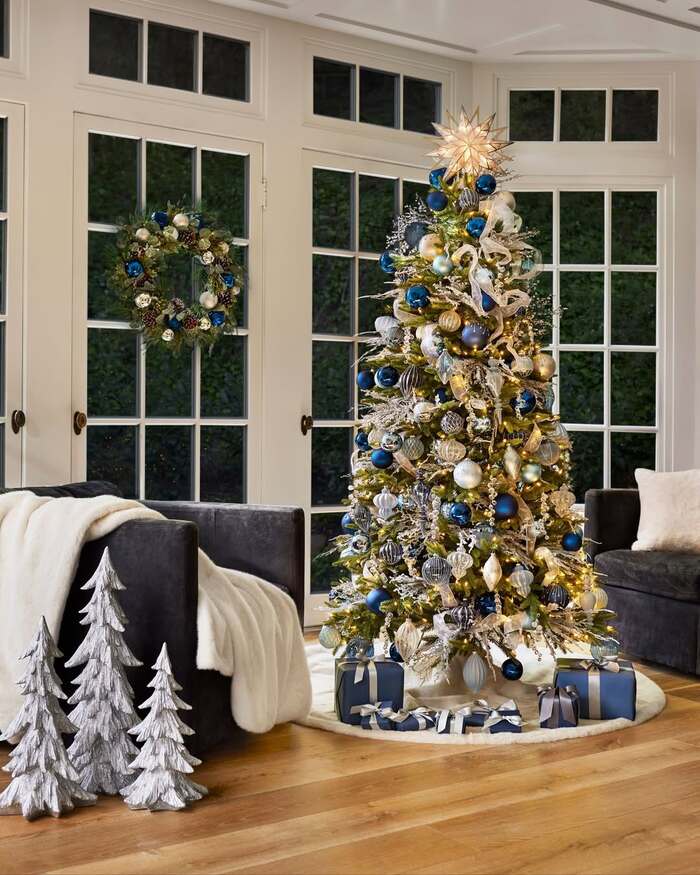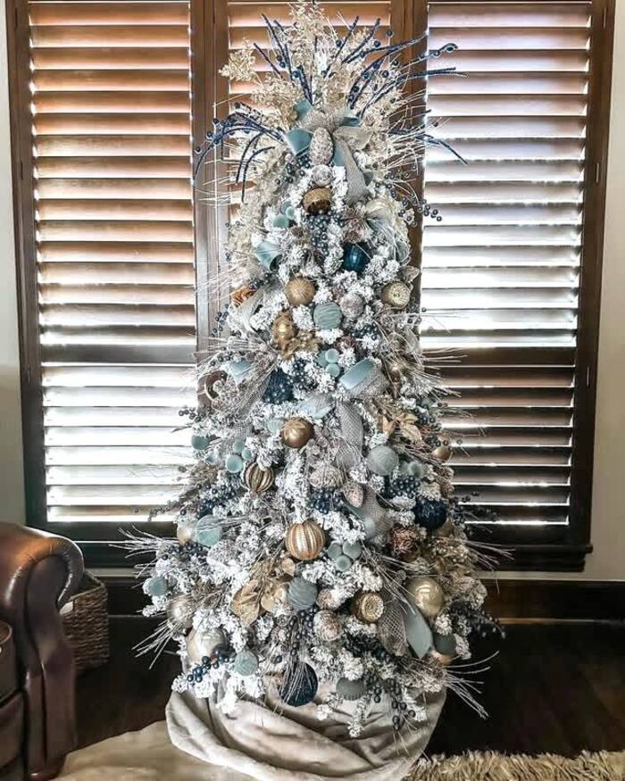 Here the tree is heavily flocked, then packed with champagne gold, slate blue, and winter berries. The topper bursts with long sprays that shoot upward like happy fireworks. It’s dramatic in the best way. I’d put this in a room with wood blinds or darker furniture because the light tones pop against it.