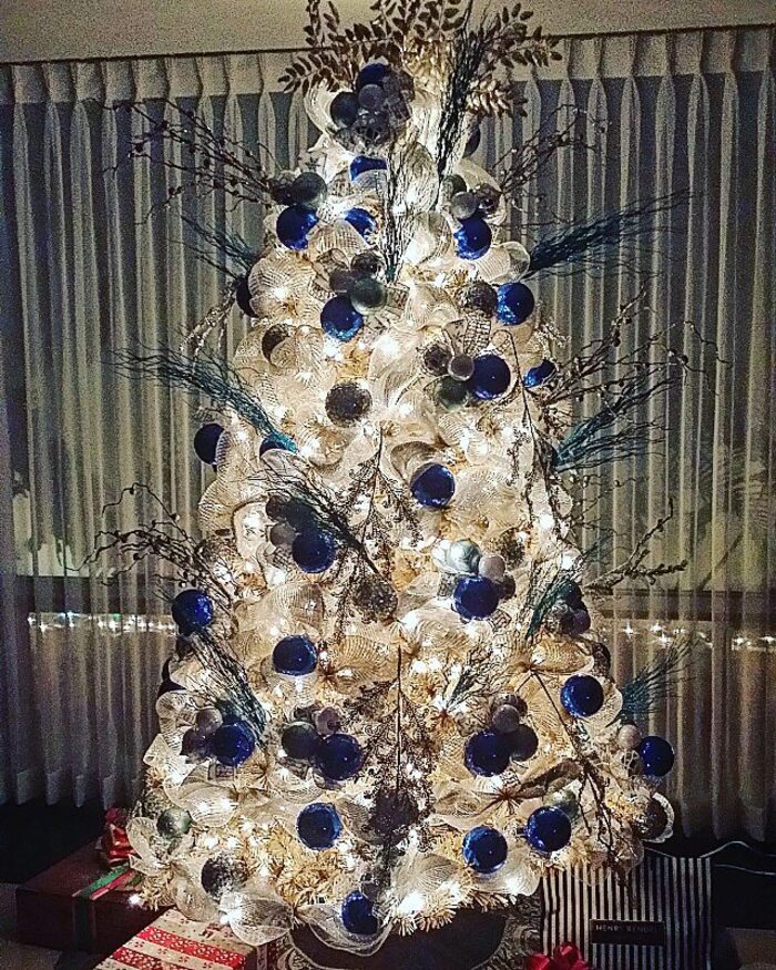 At night this one glows like a city skyline. White mesh loops fill the body, then cobalt balls and glitter branches sit on top. Peacock-colored sprigs bring this moody shimmer that I didn’t expect to love. But I do. It’s modern without feeling cold. The trick is all about rhythm, big mesh, small ornaments, long sprigs, repeat.