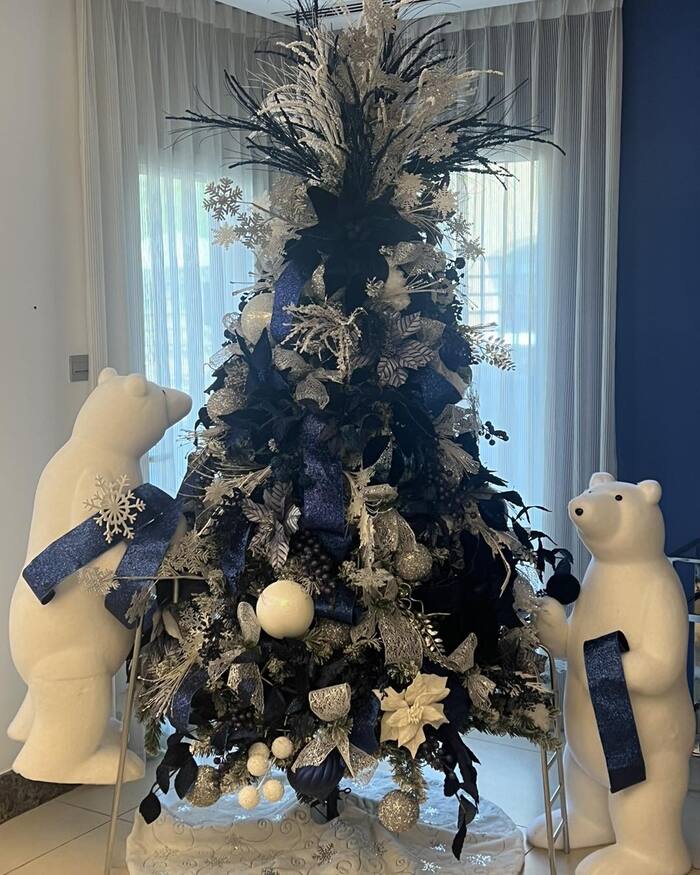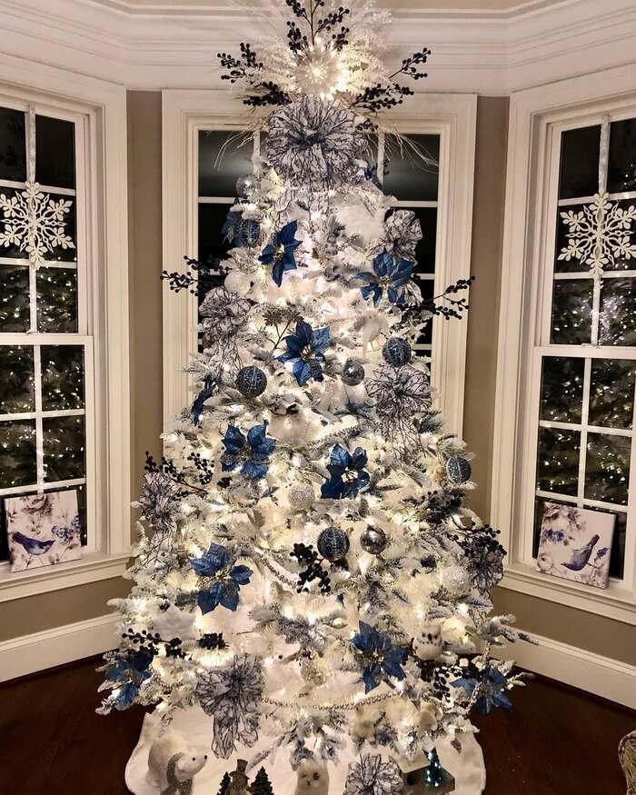 Recreate by choosing one bold character prop, bears, penguins, even big nutcrackers in white. Keep the blue-and-white Christmas tree saturated and snowy so the characters feel like they belong. Build the topper with at least five types of picks, glitter branches, white ferns, navy velvet loops, and a few snowflake stems. Angle the picks outward like a crown. This navy and white Christmas tree version loves wide open space. Add a white faux fur throw around the base for that polar ice vibe.