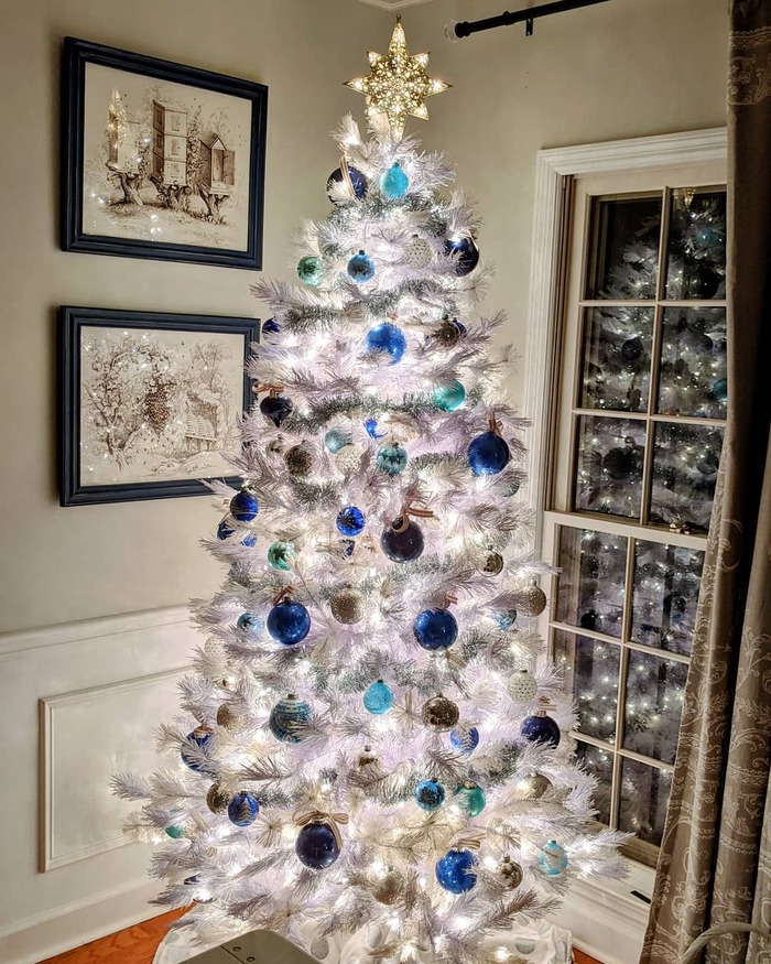 The last tree is bright and crisp. A white base, warm lights, teal and navy ornaments, and a starburst topper. It feels fresh, like new snow that nobody stepped in yet. I like the ornament spacing, not crowded, just enough to show off each ball. The teal adds a happy note that plays well with navy.