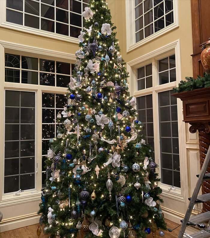 This towering beauty stands in front of huge windows, so it needs presence. The designer layered icy white flowers, cobalt ornaments, and dangling glass drops that catch every twinkle. It’s not stuffed, just thoughtfully full. Honestly, I stared too long trying to count how many different finishes are on those blue ornaments. A lot, but it still reads calm.