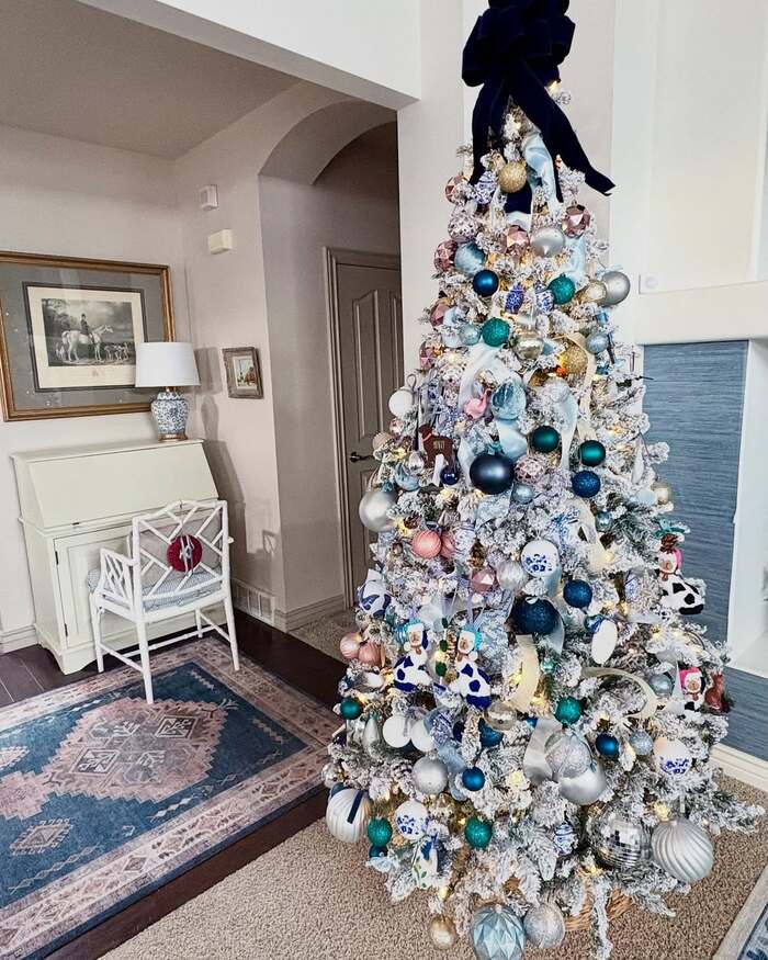 The fourth tree is flocked, so everything feels snowy. Pastel ornaments show up with navy pops and a big velvet bow on top. It’s playful but grown-up. I’m into the mix of finishes, matte, glossy, glitter, which keeps a soft tree from going flat. The flocking can shed, I know, but the look is worth one extra vacuum run.