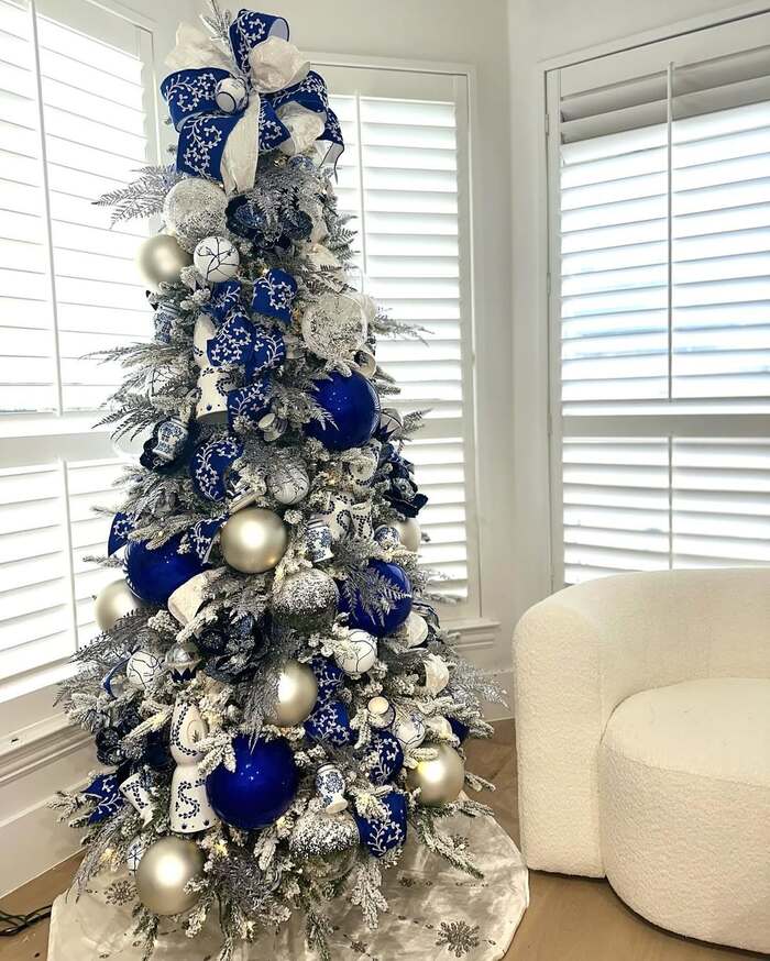 This slim tree plays the contrast game. Big cobalt ornaments stand against silver and white, with chunky ribbon bows and frosty picks. The tight shape makes it apartment friendly. I love how the ornaments are packed in, almost wreath-dense, which makes a smaller tree feel luxe. The skirt is quiet so the top half steals the show.
