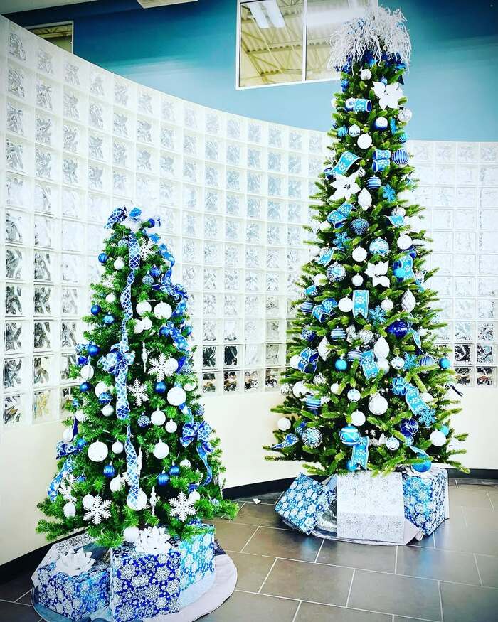 Two trees stand side by side with matching blue ribbons, white snowflakes, and lots of gift boxes wrapped in coordinating paper around the base. It’s cheerful and very doable for entryways or office corners. The trick is consistency. Same ribbon, same bow style, same gift wrap family. It feels planned and happy.