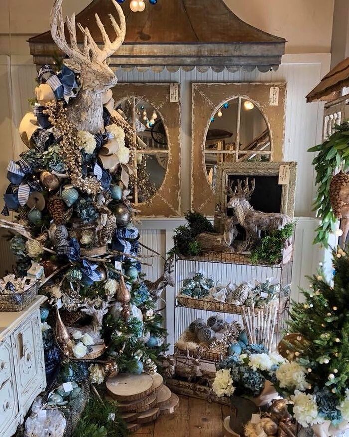 Now for something moodier. This tree mixes blue plaid ribbon, teal ornaments, pinecones, wooden beads, and a carved deer head topper. It’s rustic in the best store-bought way, like a cabin market just spilled into your living room. I know antlers are not everyone’s cup of cocoa, but here they feel whimsical, not spooky.
