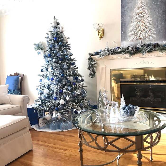 Steal the coordination. Repeat color in three zones, the tree, the mantle, and one tabletop. Use at least one transparent element to keep it light. When placing ornaments, put the blue balls inside the tree for depth and keep white on the outside edges to mimic snow. This creates a fresh, icy blue and white Christmas tree feel that still warms up when the fireplace is on. Fold two soft throws, one gray, one blue, over the chair to tie everything together.