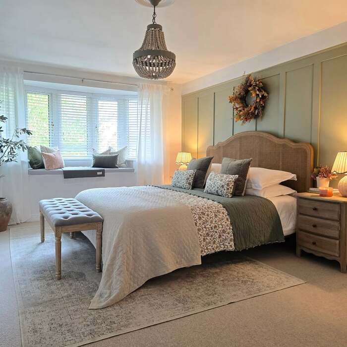This room surprised me. The wall is olive with board-and-batten, yet the bedding layers soft sage and faded blue prints. A woven headboard keeps it casual. Over the bed, a dried wreath leans warm rustic. If your spouse is nervous about too much color, this mix reads nature-forward and calm. To steer it toward a blue winter bedroom, pull in denim blue pillow covers and a chambray throw at the foot.