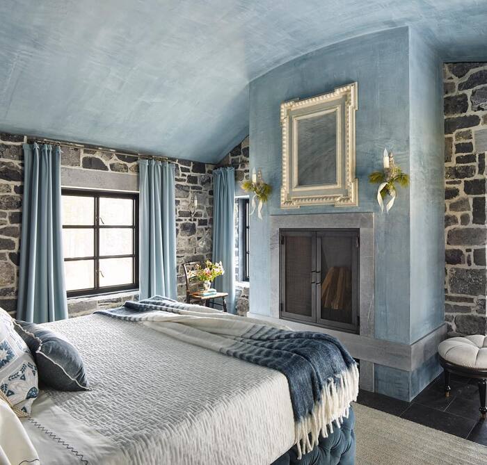 Settle into drama. We’ve got stone walls, a plastered sky-blue fireplace, and drapes in the same family so the room feels wrapped. A framed empty mantel detail becomes art, which is odd but also cool. If you love a cocooning feel, this is your blueprint. Keep bedding pale and let throws carry the blues. A charcoal stripe throw layered over soft white adds the winter story without shouting.