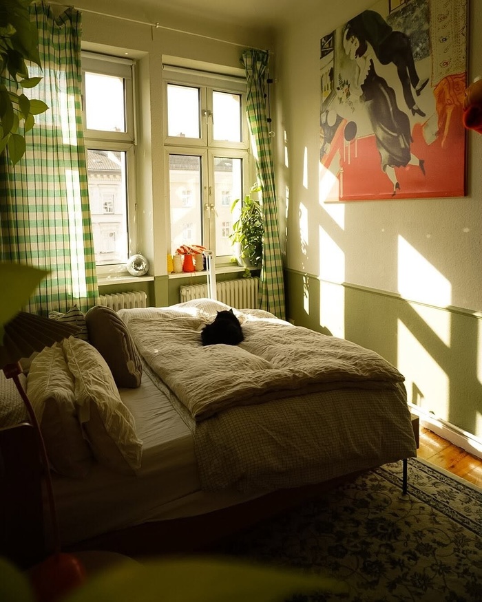 Another hit for my list of boho bedroom curtain ideas: Match curtain length to the height of your artwork so the eye moves smoothly.