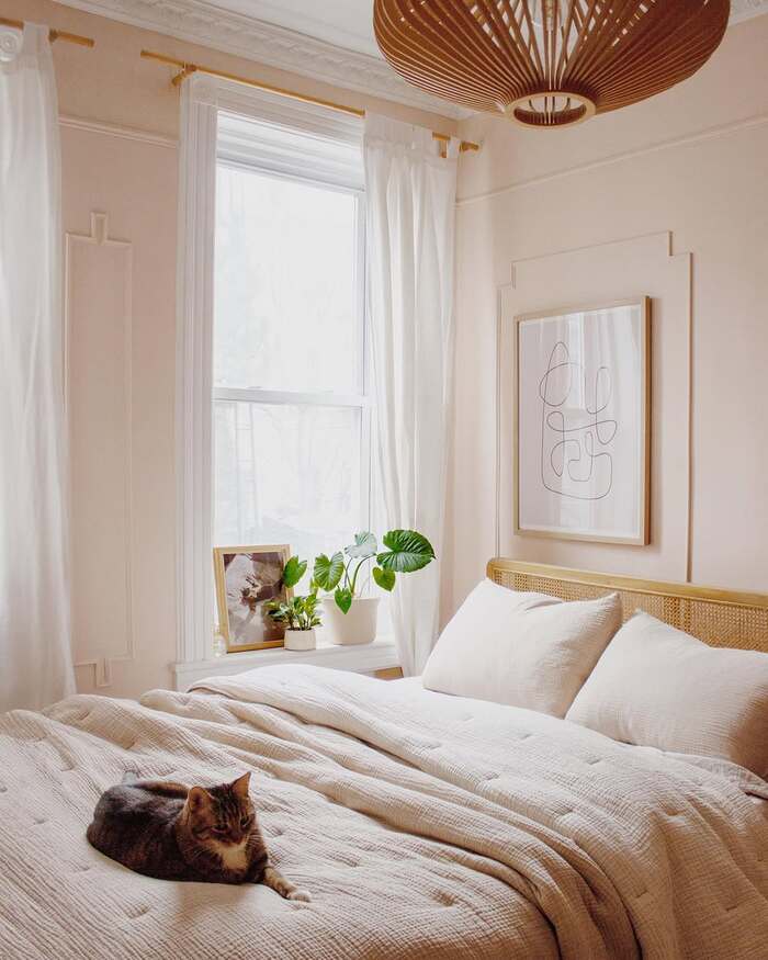 This sunny room proves you don’t need complex fabric to feel styled. Two crisp, skinny panels hang just past the window trim. Everything is peach, cream, and cane. The layout keeps floor space open, which makes the room feel bigger. For renters, tension rods and bohemian bedroom curtains in lightweight cotton are low-stress.