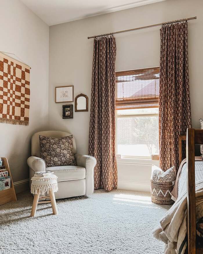 Printed rust drapes hang high and wide over bamboo shades. The color is warm but still calm, perfect for reading in that cushy chair. Décor adds handmade touches: basket, quilt, tiny mirrors. To steal it, layer boho style curtains over natural shades for depth. Finish with a tassel pillow so the textures talk to each other.