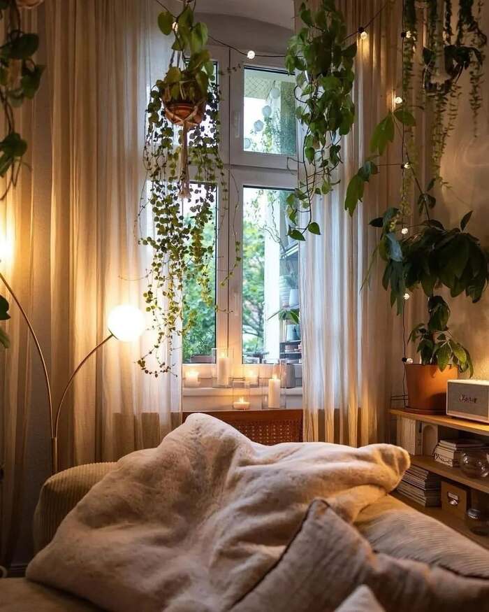 Tall, gauzy panels puddle lightly on the floor while vines and string lights trail across the window. The décor is lush and imperfect in the best way. Diffused daylight keeps it calm; at night, the tiny bulbs turn everything golden.