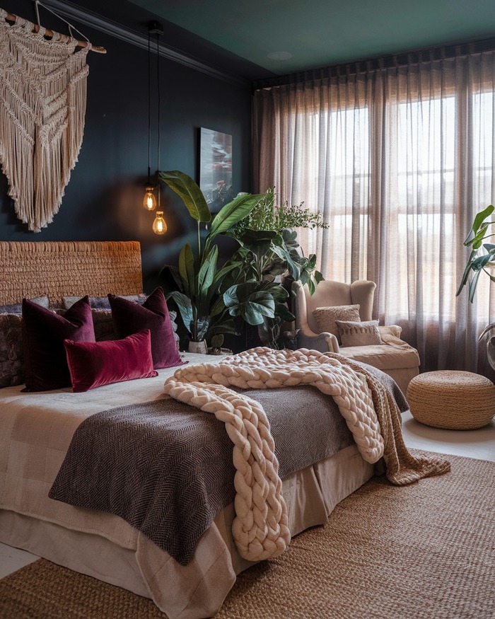Deep charcoal walls with linen-look brown sheers. The style feels grown-up bohemian, like a jazz record playing while you knit a chunky throw. The color contrast is cozy not gloomy, thanks to warm lamps and natural fiber rugs.