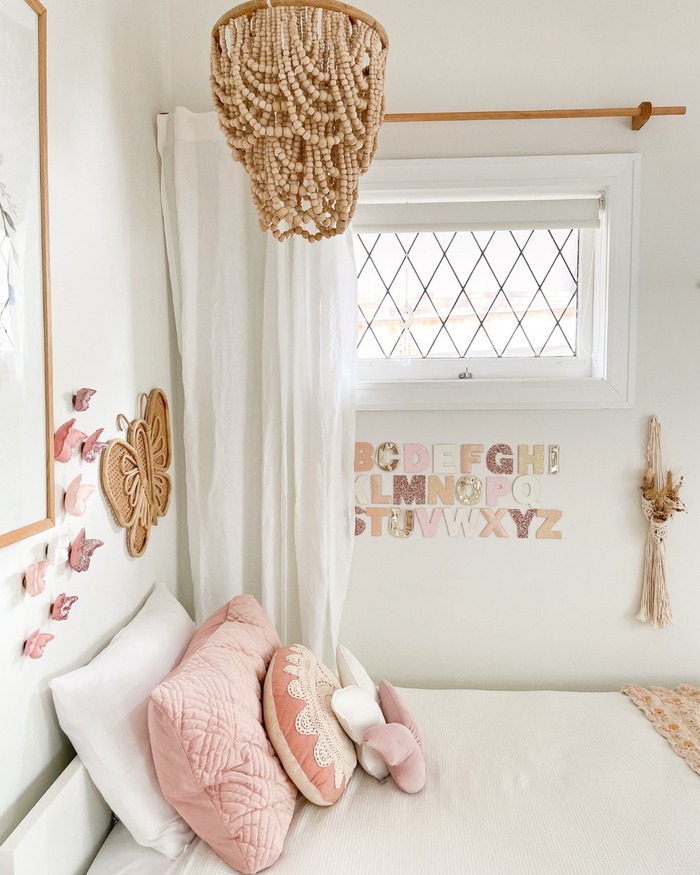 A simple white panel hangs from a wooden rod, letting sun sparkle around a bead chandelier and butterfly wall art. The palette is creamy with blush pillows, so the curtain acts like a soft frame. Layout note: a single-panel look works in small rooms where two panels feel heavy.