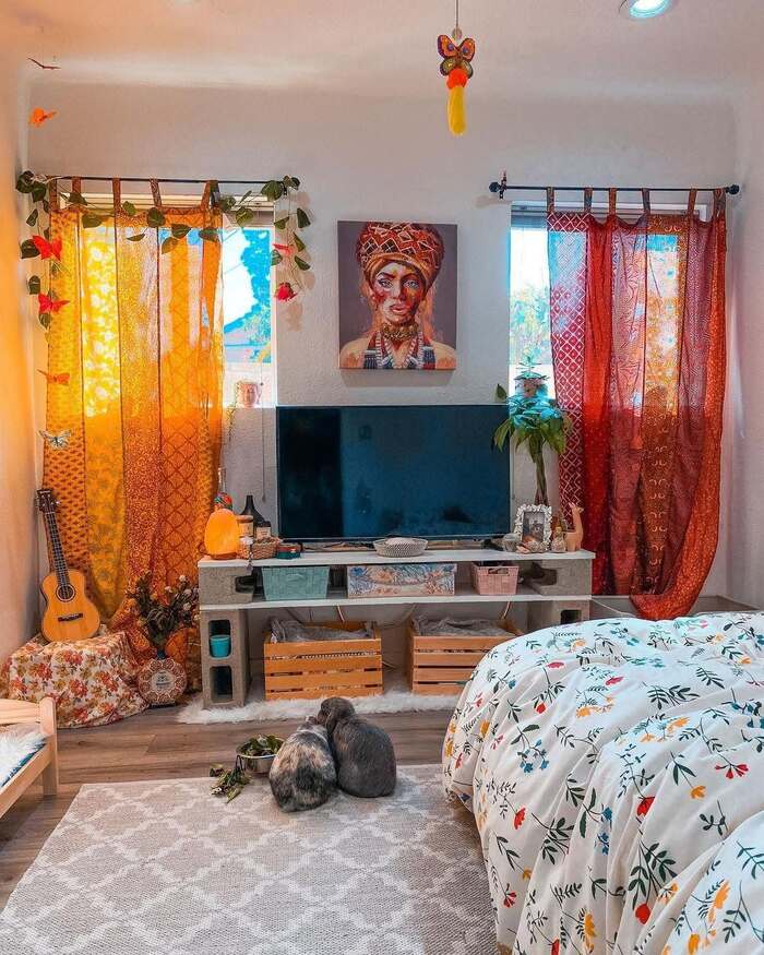 My tip: Choose boho window treatments that are semi-sheer so your plants still get sun. Another set of boho bedroom curtain ideas here is to swag a strand of lights across the rod for instant mood.