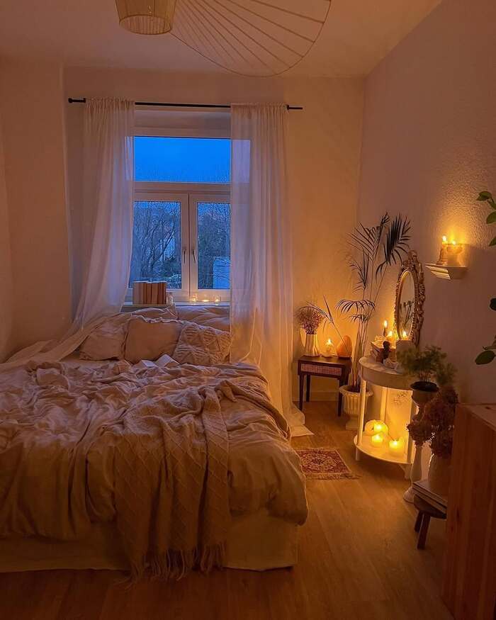 The room glows with candles while long white sheers float against twilight. Everything feels soft, almost cinematic. Color stays quiet so the light can dance. Place battery candles on a tray near the window for sparkle without risk, then layer boho sheer curtains behind heavier drapes for weight.
