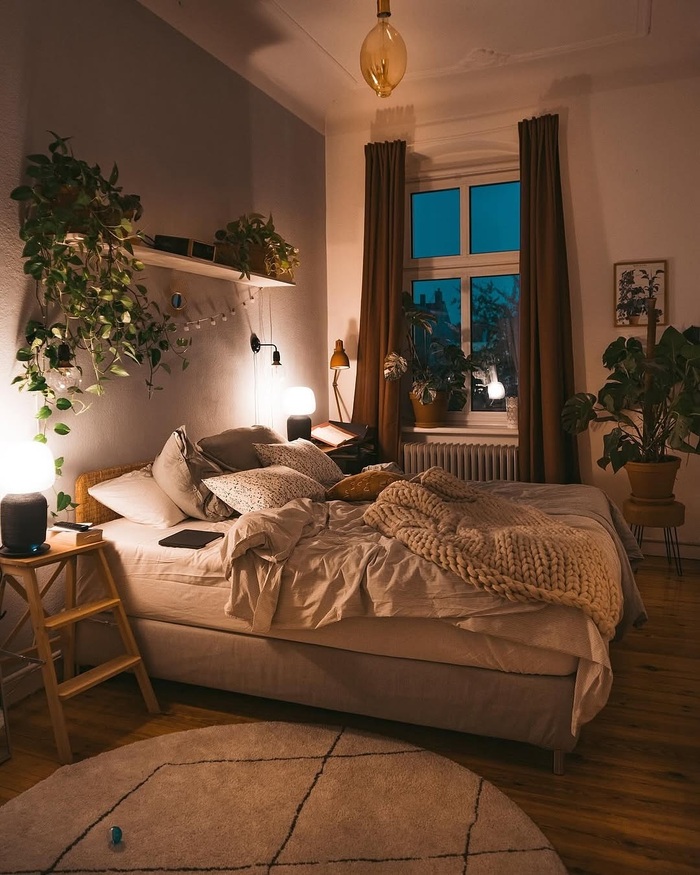 Here, heavy cocoa drapes frame a plant-filled corner and a woven headboard. The lighting is mixed, both table and wall lamps, which keeps the shadows interesting. The décor reads collected, not curated.