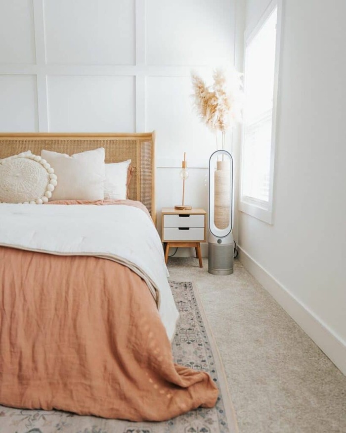 Rattan plus terracotta is my new couple crush. The rattan headboard gives shape and texture without feeling heavy. Terracotta sheets read warm but calm, especially with white walls. That tall vase of pampas grass adds movement and height.