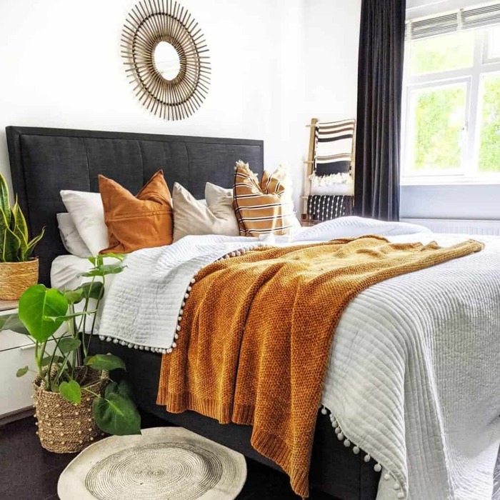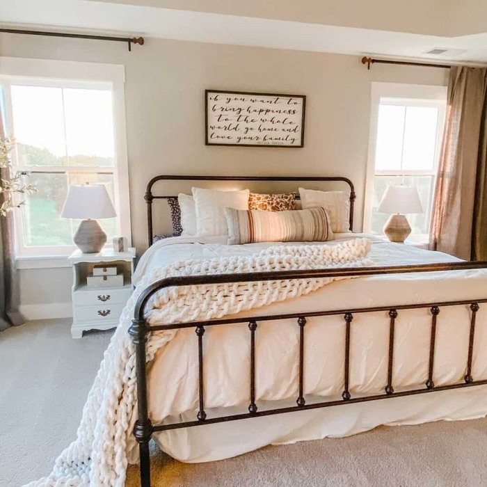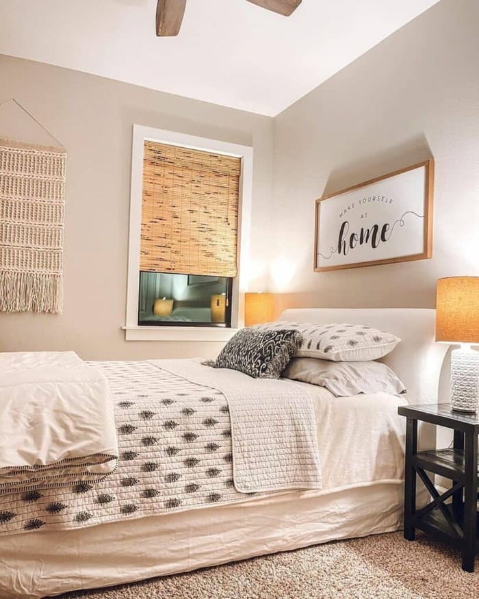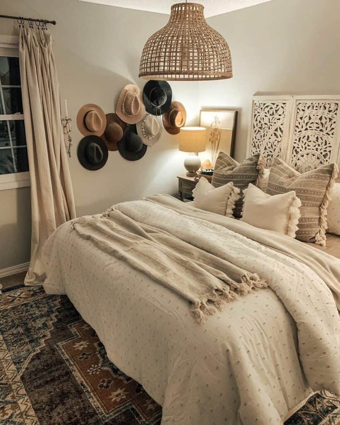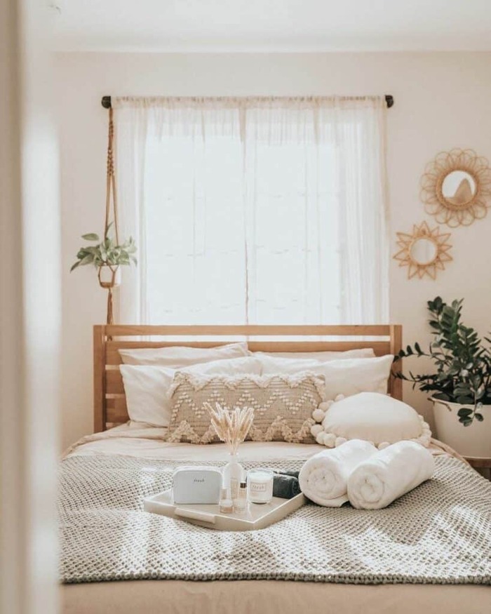I keep coming back to this simple bed because it nails that cozy boho vibe without trying too hard. Soft cream bedding, a hand-knit throw, and sunlight from both windows make the room feel open and calm.