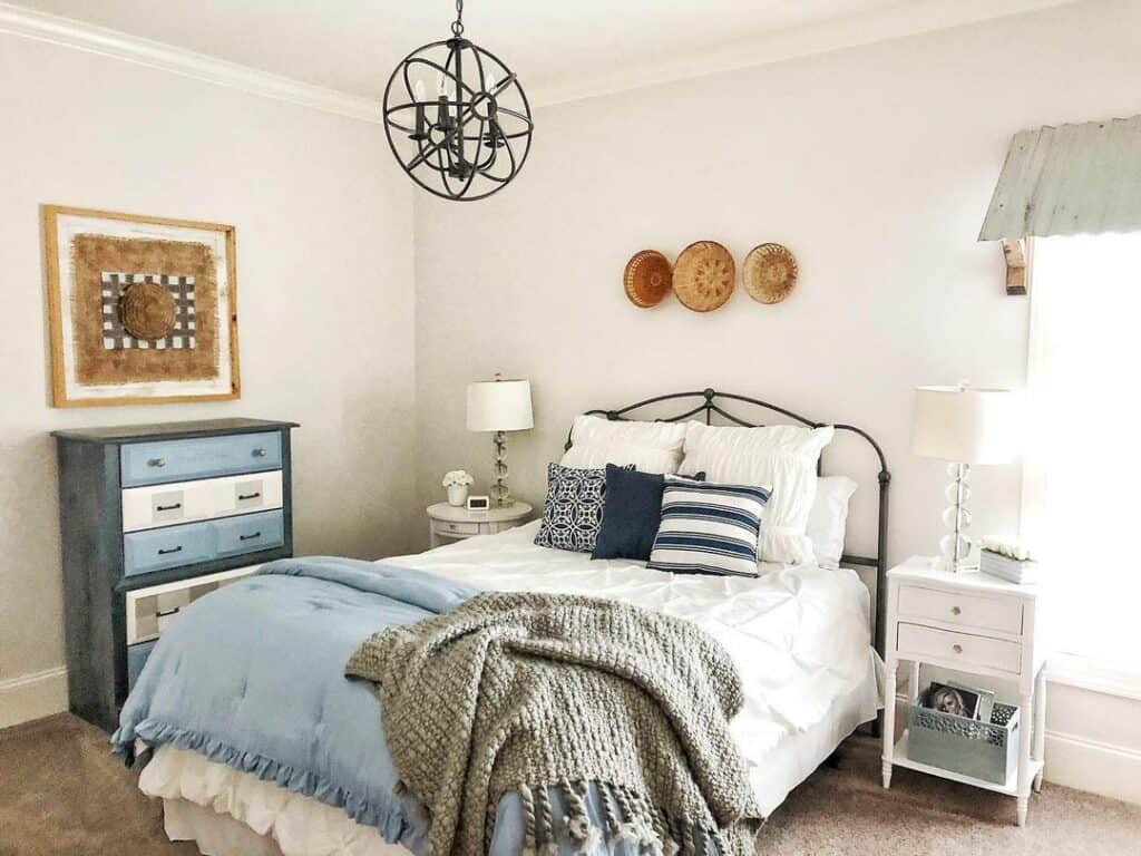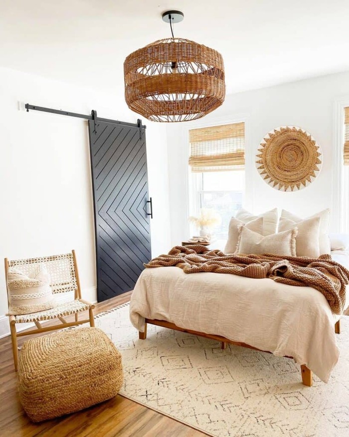 This space proves one bold woven pendant can carry the whole room. The natural shades, clean white quilt, and a textured ottoman give you that “I just air-dried the linens” look I love.