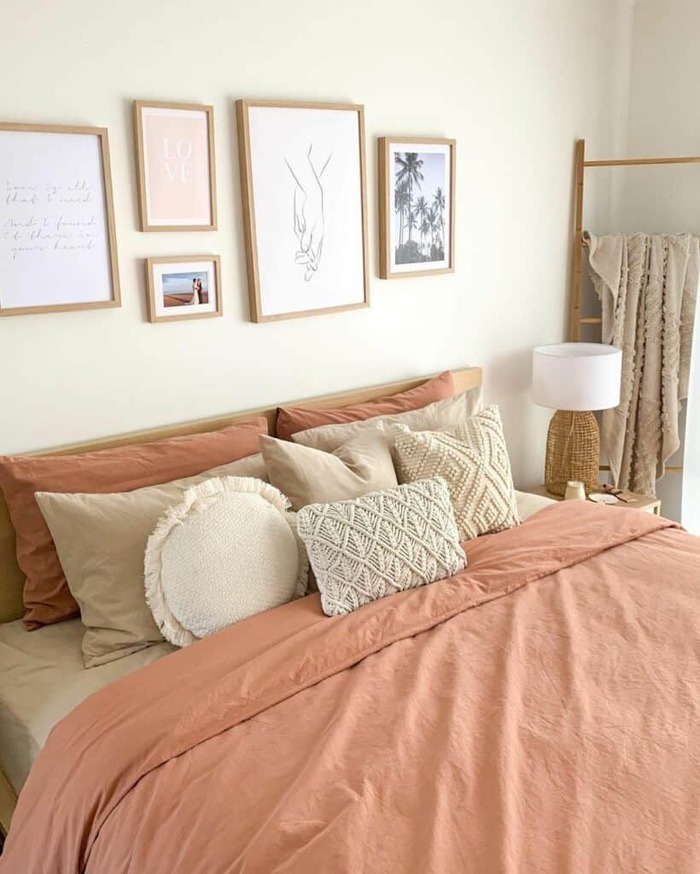 Confession time. I’m weak for terracotta. It’s earthy, flirty, and weirdly flattering to every wall color. Here it’s paired with beige sheets and a row of nubbly, macramé-style pillows. For renters, swapping in a warm duvet like this is the fastest boho upgrade ever.
