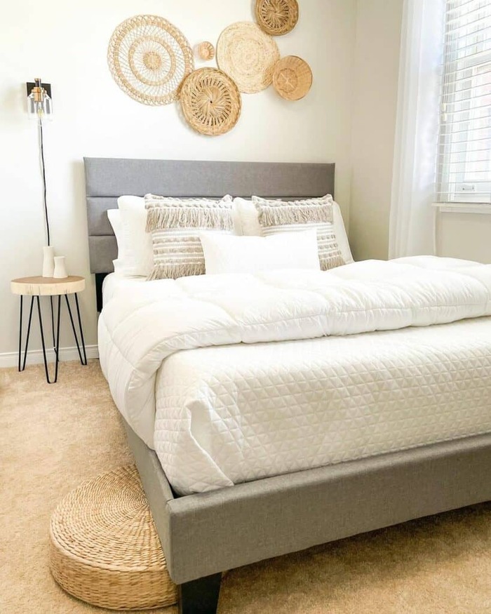 Start with one large round basket just off center, then spiral smaller ones around it. The cushy white bedding keeps all that texture from feeling too busy.