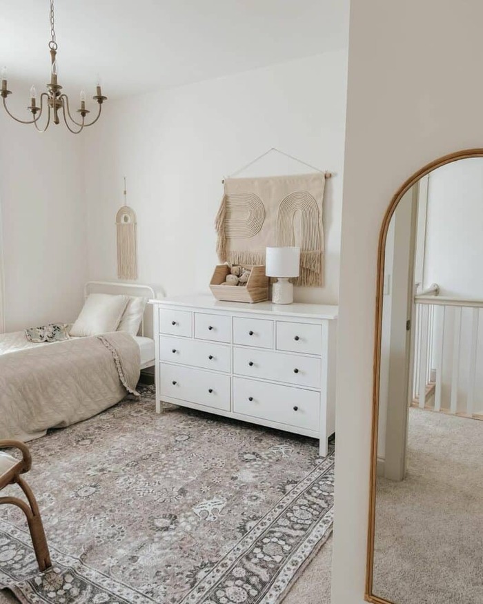 Add a woven wall hanging over the dresser for warmth, then keep the rest simple so your eye can chill.