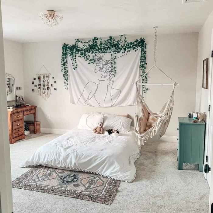 Tapestry headboard and a hammock chair